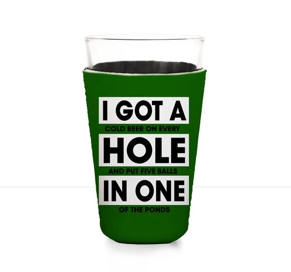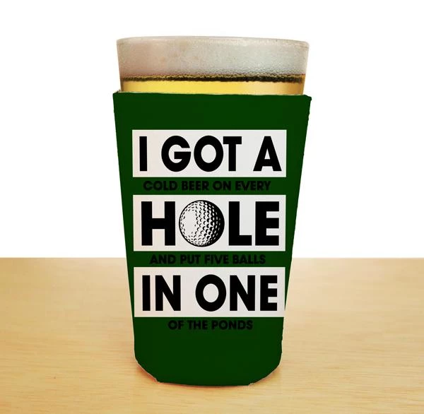 We know most golfers like to enjoy one or two cold brews, so why not get them a handy pint glass holder to keep their beer nice and cold! This neoprene sleeve will perfectly wrap around any standard sized pint glass and keep it insulated while you enjoy your favorite beverage, and who doesn’t love a little golf humor? The utility and style this product offers just can’t be beat! Add your name or any text of your choice to the back side of this pint glass hugger. The “add your name” is an optional feature, but it is certainly a cool way to claim it as yours! They are even small enough to fit right in your pocket! Use them around the house, or carry to the bar to always have a little extra insulation for your pint glasses.