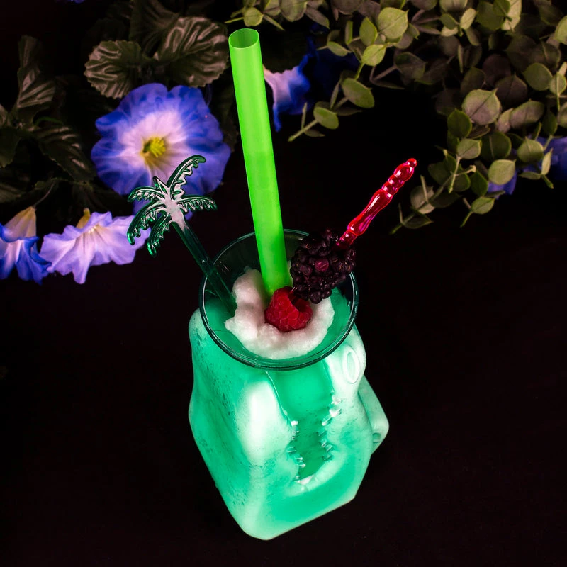 Whip up some frozen fruity cocktails in this Green Gator Party Yard cup for your next social gathering. This gator cup is made of durable plastic and features an embossed design of an alligator’s head displaying its wavy shaped mouth and small teeth down the sides of the cup. It also has a small curved hump towards the bottom with the gator’s eyes. the capacity of this cup is 27 ounces and measures 7.25″ in length and has a 2.5″ rim diameter.