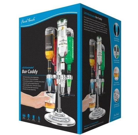 Pour like a pro with the LED Illuminated 4 Bottle Bar Caddy / Liquor Dispenser. This easy to use liquor dispenser is great for man caves, kitchen counter-tops, home bars, and more. The LED lights illuminate every time you pour a perfect shot. Plus the dispensers are leak-proof and the base has an elegant chrome finish. A LED illuminated liquor dispenser looks great in any setting!