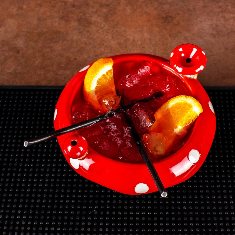 This tiki bowl is truly a unique piece of drinkware to give you and your friends great experience. It is made of durable ceramic and measures 3.5″ in height and has a rim diameter of 5″. This mushroom themes tiki has a wide round bowl that is red with white spots and has a wide mushroom stem base. Has a liquid capacity of 10 ounces and is recommended to be hand wash only.