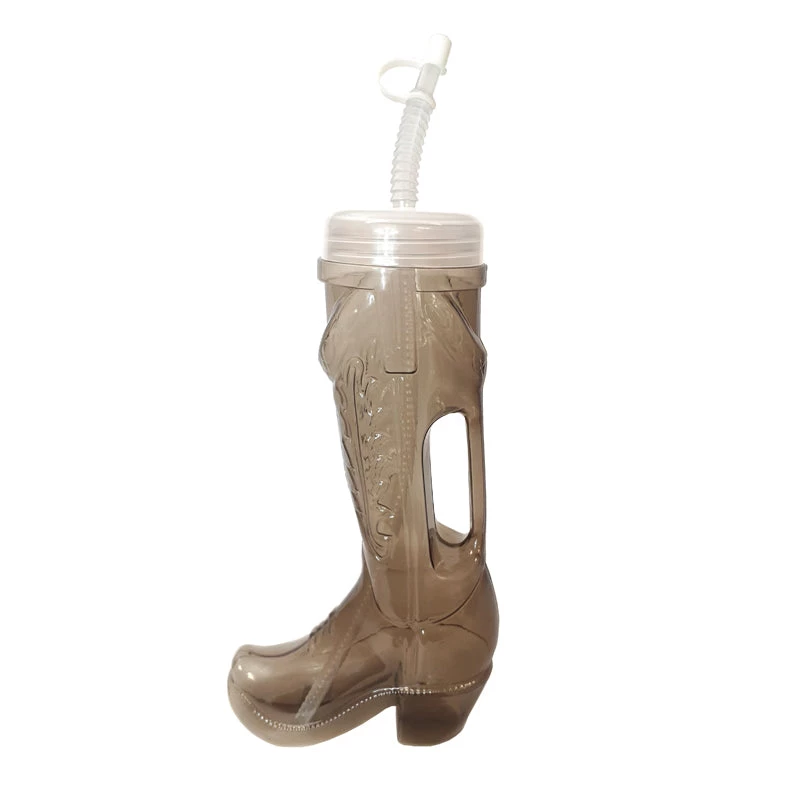 New 32 ounce plastic smoke colored cowboy boot cup. The plastic is molded to a designer cowboy boot that not only gives the appeal of Old Western footwear but also provides a handle to hold it. Comes with a lid that screws on tightly, straw and straw cap. Your guests will be saying a big YEE-HAW! Measures 10.5โ H x 5.5โ W x 2 โ โ Rim.
