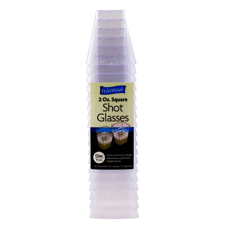 These shot glasses are perfect for having some extra fun at your next party The clear plastic highlights the shots being served for any occasion. These cups are recyclable therefore reducing waste making these cups environmentally friendly. They are easily stackable and provide an easy clean up. Each cup has a liquid capacity of 2 ounces and each pack comes with 18 cups.