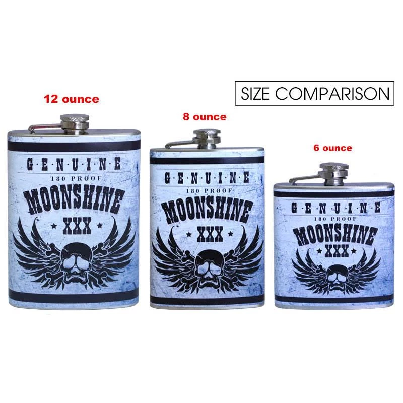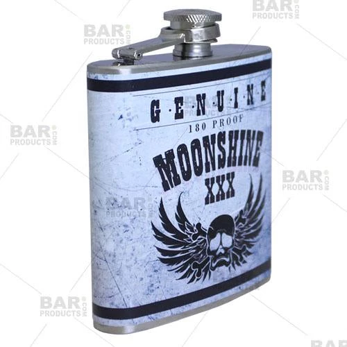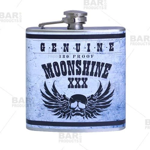 These trendy Hip Flasks not only showcase an extremely high quality, thick food grade (304) stainless steel material, but they also feature a full color design wrap to add a bit more personality to your incognito cocktail. This cool moonshine label design is trendy and fun to represent your favorite booze incognito.