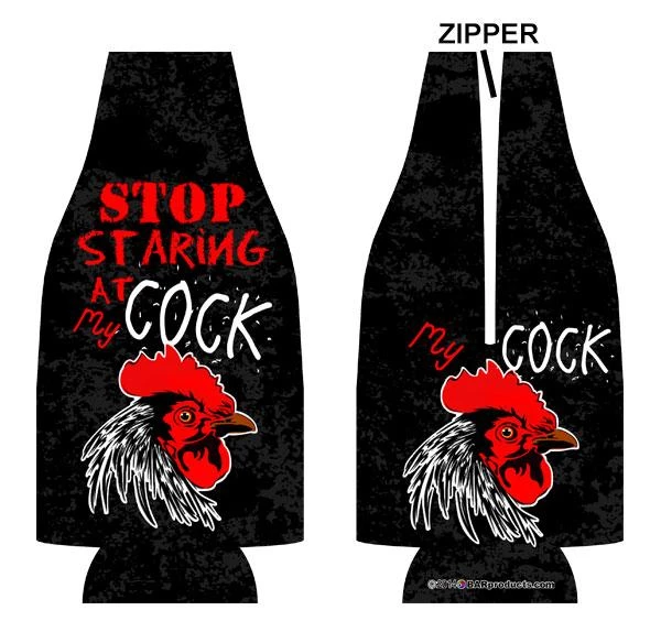 Every time I see this bottle cooler I cannot stop laughing. It’s the Stop Staring At My Cock bottle cooler. This bottle cooler features bright lettering, vivid cock image and a zipper front. These bottle coolers work wonders at keeping your beer colder longer.